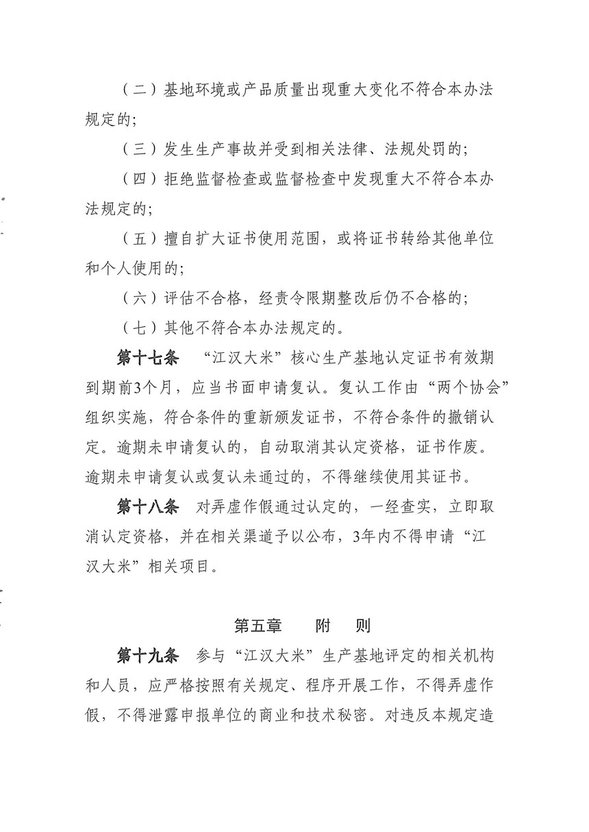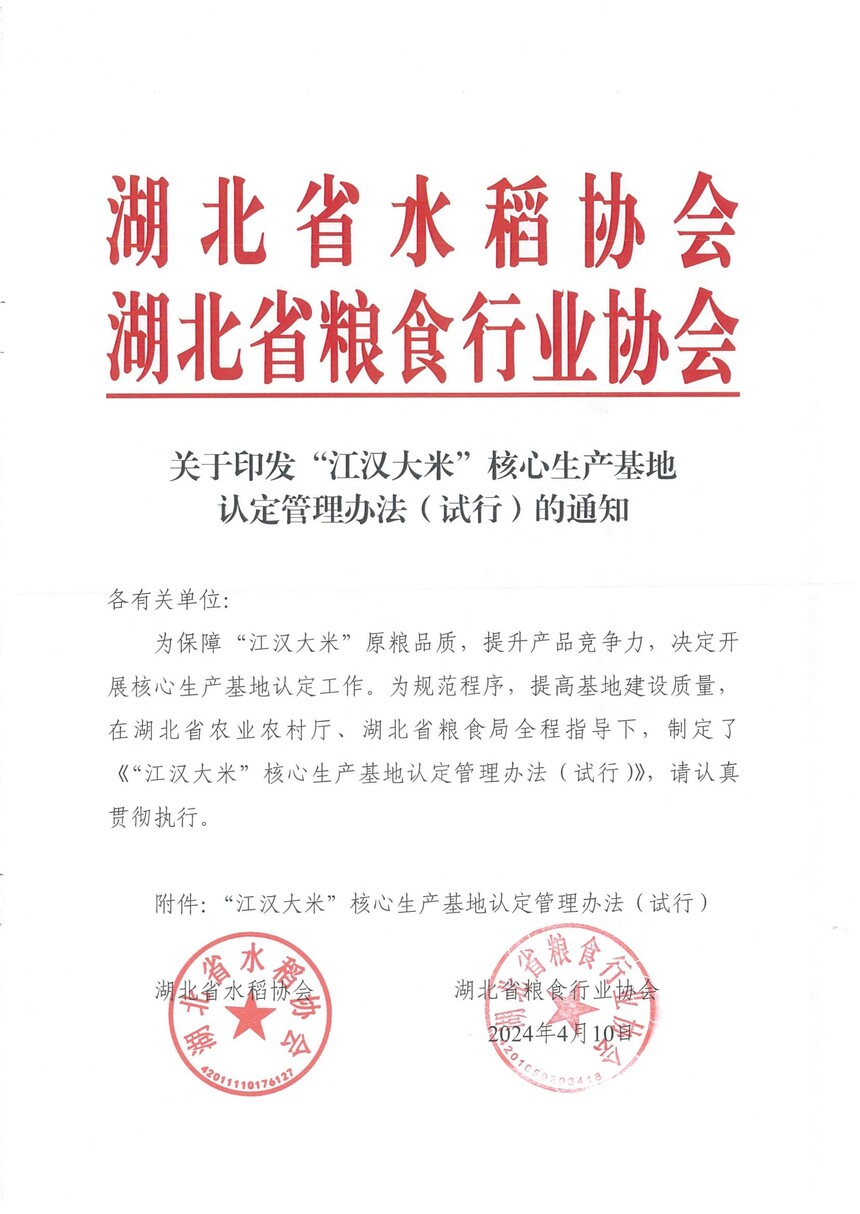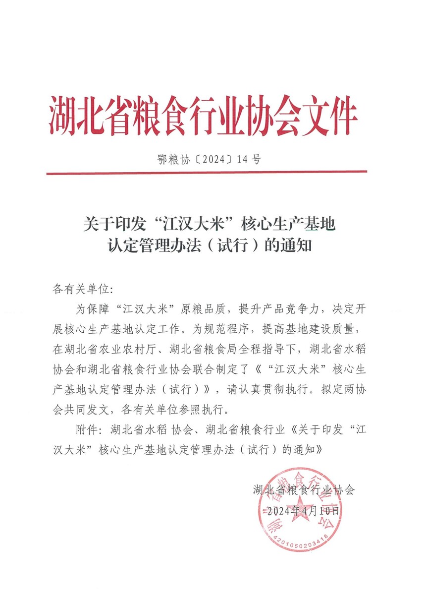 关于印发“江汉大米”核心生产基地认定管理办法(试行)的通知时间:2024-04-12 各有关单位: 为保障“江汉大米”原粮品质,提升产品竞争力,决定开展核心生产基地认定工作。为规范程序,提高基地建设质量,在湖北省农业农村厅、湖北省粮食局全程指导下,制定了《“江汉大米”核心生产基地认定管理办法(试行)》,请认真贯彻执行。拟定两协会共同发文,各有关单位参照执行。 附件:湖北省水稻协会、湖北省粮食行业协会《关于印发“江汉大米”核心生产基地认定管理办法(试行)》 湖北省粮食行业协会 2024年4月10日